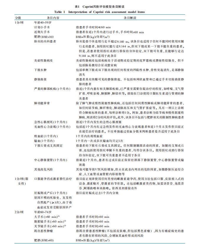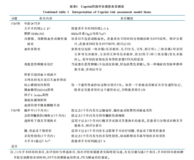 建議對(duì)所有普通外科患者進(jìn)行VTE風(fēng)險(xiǎn)評(píng)估,基于臨床經(jīng)驗(yàn)和大量的循證醫(yī)學(xué)證據(jù),推薦使用Caprini風(fēng)險(xiǎn)評(píng)估模型,對(duì)普通外科患者進(jìn)行VTE風(fēng)險(xiǎn)評(píng)估。Caprini風(fēng)險(xiǎn)評(píng)估模型涵蓋了住院患者常見(jiàn)的各類VTE風(fēng)險(xiǎn)因素,該模型在世界范圍內(nèi)廣泛運(yùn)用并在中國(guó)人群中得到了驗(yàn)證。2016年發(fā)表的《中國(guó)普通外科圍手術(shù)期血栓預(yù)防與管理指南》中,明確推薦使用Caprini風(fēng)險(xiǎn)評(píng)估模型評(píng)估普通外科圍手術(shù)期患者的VTE發(fā)生風(fēng)險(xiǎn)。建議護(hù)理人員通過(guò)查閱病歷問(wèn)診、查體,實(shí)驗(yàn)室檢查等方法,獲取全面且準(zhǔn)確的患者疾病信息,并在正確理解Caprimi風(fēng)險(xiǎn)評(píng)估模型各條目含義(表1)的基礎(chǔ)上,對(duì)患者進(jìn)行VTE風(fēng)險(xiǎn)評(píng)估,以提高風(fēng)險(xiǎn)評(píng)估結(jié)果的準(zhǔn)確性和有效性。此外國(guó)際標(biāo)準(zhǔn)化比值,D-二聚體等凝血指標(biāo)可以動(dòng)態(tài)體現(xiàn)患者的凝血功能情況,當(dāng)患者病情平穩(wěn),而D-二聚體進(jìn)行性升高時(shí),應(yīng)當(dāng)警惕VTE的發(fā)生。建議護(hù)理人員在對(duì)普通外科患者進(jìn)行VTE風(fēng)險(xiǎn)評(píng)估時(shí),持續(xù)關(guān)注患者的國(guó)際標(biāo)準(zhǔn)化比值,D-二聚體等實(shí)驗(yàn)室指標(biāo)變化,以達(dá)到VTE預(yù)警監(jiān)測(cè)的目的。