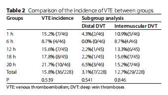 結(jié)果:230例患者中有2例因提前出院而退出治療,228例患者被納入最終分析。平均年齡為60.38±13.33歲。五組間的基線特征具有可比性。與其他組相比,6小時(shí)VFP治療的患者DVT發(fā)生率最低(8.7%,4/46),其次是1小時(shí)VFP(15.2%,7/46)、12小時(shí)VFP(15.6%,7/45)、18小時(shí)VFP(17.8%,8/45)和20小時(shí)VFP(21.7%,10/46),但無(wú)統(tǒng)計(jì)學(xué)差異(P=0.539)。在術(shù)后凝血檢查方面,與其他四組相比,接受6小時(shí)VFP治療的患者d-二聚體最低(P=0.658),APTT最高(P=0.262)。與其他四組相比,6小時(shí)VFP的疼痛評(píng)分最低(P=0.206)和舒適性評(píng)分最高(P=0.288)。