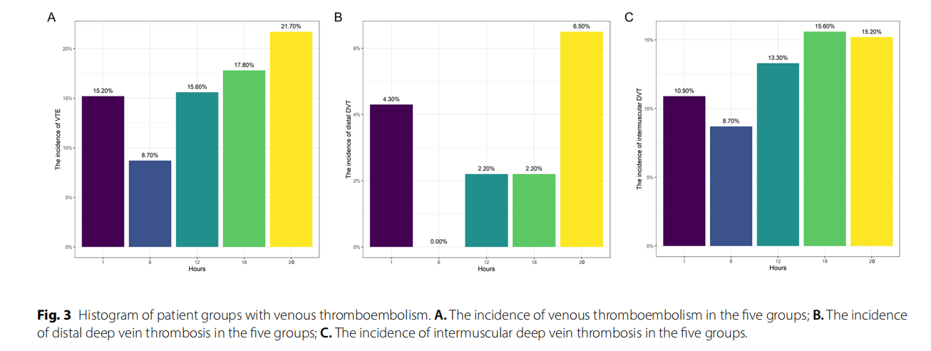5組DVT發(fā)生率與其他組相比,6小時(shí)VFP治療的患者DVT發(fā)生率最低(8.7%,4/46),其次是1小時(shí)VFP(15.2%,7/46)和12小時(shí)VFP(15.6%,7/45)(P=0.539,表2)。當(dāng)患者接受VFP治療≥6h時(shí),DVT的發(fā)生率呈上升趨勢(shì)?;颊弑壤龔?小時(shí)VFP治療后的8.7%(4/46)增加到>18小時(shí)VFP治療后的21.7%(10/46)(圖3A)。根據(jù)亞組分析,在遠(yuǎn)端DVT(圖3B)和肌間DVT(圖3C)方面也觀察到類似的趨勢(shì)。然而,未觀察到近端DVT或PE。