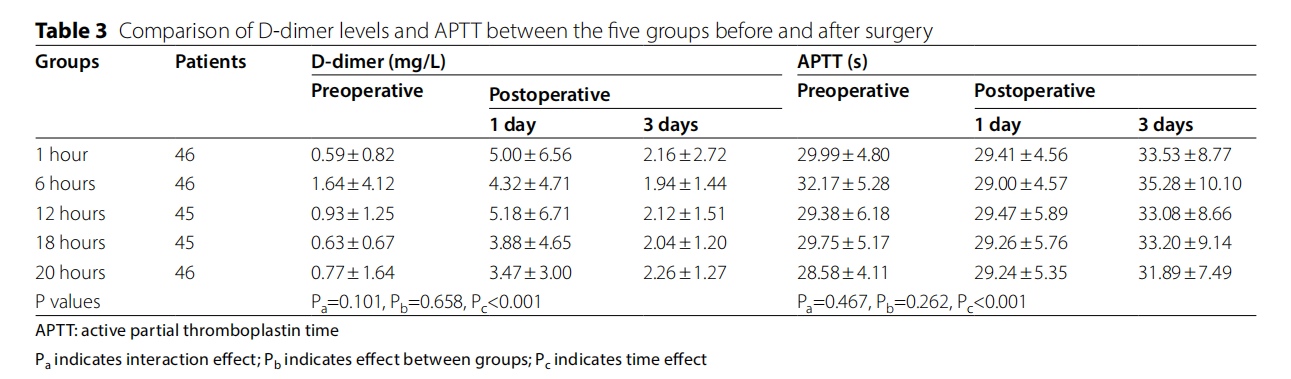 與術(shù)前1天相比,D-二聚體在術(shù)后1天顯著升高,并且在術(shù)后3天顯著降低(P<0.001,表3;圖4A)。接受6小時(shí)VFP治療的患者d-二聚體在五組中最低,但無(wú)統(tǒng)計(jì)學(xué)差異(P=0.658)。與其他組相比,接受6小時(shí)VFP治療的患者的APTT也最高(P=0.262)(圖4B)。以上結(jié)果表明,VFP應(yīng)用的5個(gè)持續(xù)時(shí)間對(duì)VTE均有良好的預(yù)防作用。