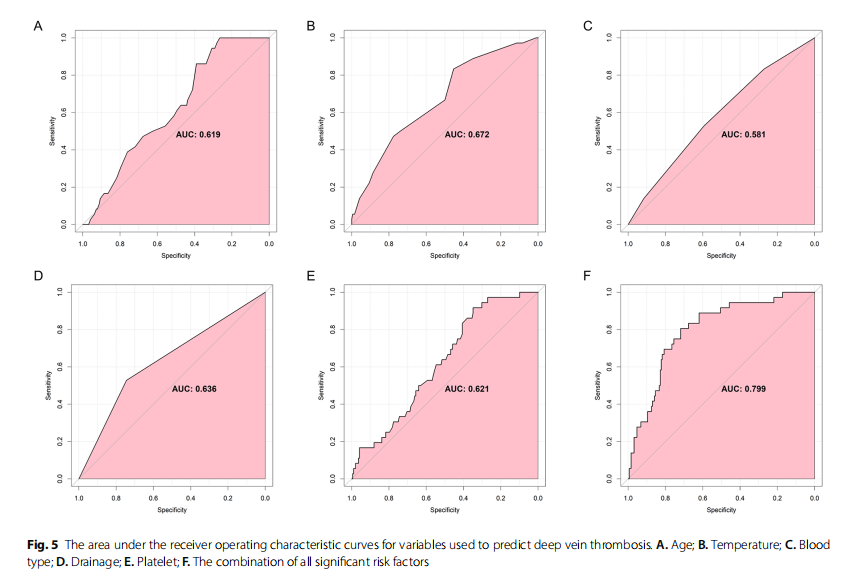 多因素分析顯示,年齡(P=0.036)、高體溫(P=0.018)、低SBP(P=0.016)、AB(P=0.046)或B(P=0.021)血型、引流(P=0.045)、低血小板計(jì)數(shù)(P=0.047)與DVT呈顯著正相關(guān)(表5)。年齡、體溫、血型、引流液、血小板計(jì)數(shù)和所有顯著危險(xiǎn)因素組合的AUROC分別為0.619、0.672、0.581、0.636、0.621和0.799(圖5A-F)。以上結(jié)果表明,這些變量是深靜脈血栓的良好預(yù)測(cè)因素。
