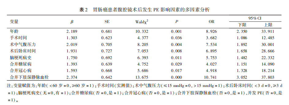 將單因素分析中差異有統(tǒng)計學意義的年齡、手術時間、術中氣腹壓力、術后臥床時間、腦梗死病史、合并糖尿病、合并冠心病、合并下肢深靜脈血栓作為自變量,胃腸癌患者腹腔鏡術后是否并發(fā)PE作為因變量,進行多因素 Logistic回歸分析。 分析結果顯示,年齡≥ 60歲、手術時間長、術中氣腹壓力 > 15 mmHg、術后臥床時間≥3d、有腦梗死病史、合并糖尿病、合并冠心病、合并下肢深靜脈血栓均是導致胃腸癌患者腹腔鏡術后發(fā)生PE的獨立危險因素(P< 0.05)(表 2)。