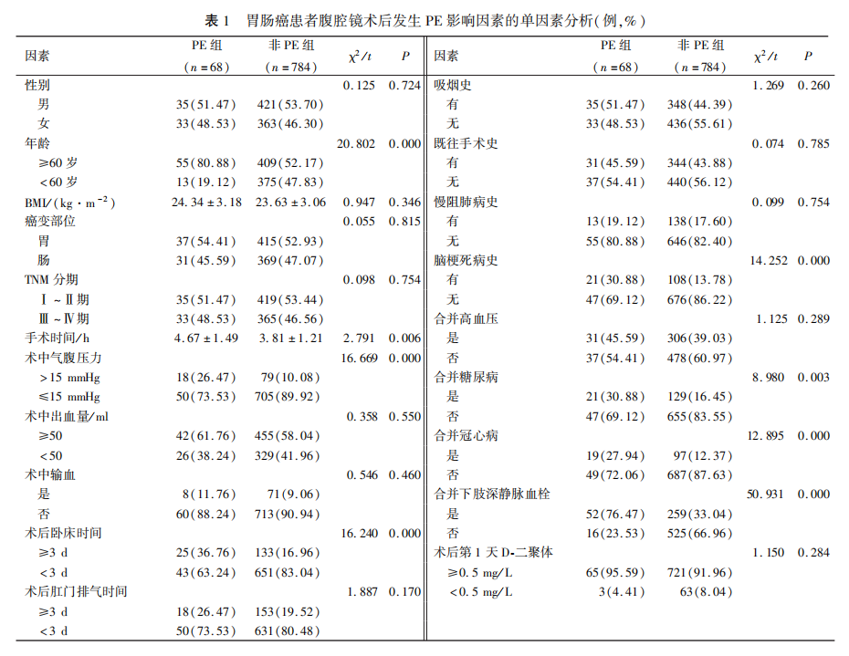 胃腸癌是臨床常見的消化系統(tǒng)惡性腫瘤,致死率極高,據統(tǒng)計,胃癌和結直腸癌的致死率在全部惡性腫瘤中分別排第三位和第四位。 近年來,隨著生活水平的不斷提升、飲食與生活方式不斷變化,胃腸癌的發(fā)生率呈現出不斷上升的趨勢,而以手術治療為核心的綜合治療也逐漸成為胃腸癌的主要治療手段 。 目前,腹腔鏡手術因其創(chuàng)傷小、出血少、恢復快等優(yōu)勢已被廣泛應用于胃腸癌患者的臨床治療中,但由于其氣腹過程會引起腹內壓、靜脈壓等異常,進而會導致血瘀、血栓的發(fā)生,故常易引發(fā)患者發(fā)生術后肺栓塞 (PE)。PE是常見的肺功能障礙疾病,患者的1個月致死率高達 4.9%~6.6% ,一旦發(fā)生會顯著增加患者預后不良的發(fā)生風險。 萬霖等表示,惡性腫瘤患者進行手術治療后發(fā)生致死性 PE 的幾率高達 6% ,其中腹腔鏡手術治療后的 PE發(fā)生率更高。 故,為降低胃腸癌患者腹腔鏡術后發(fā)生PE的風險,及早做好預防與治療措施,本研究特選取852例行腹腔鏡手術治療的胃腸癌患者為研究對象, 分析導致其發(fā)生術后 PE的危險因素,以期為胃腸癌患者腹腔鏡術后PE的預防與早期干預提供參考。